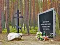 The monumental slab at the entrance to the Sandarmokh burial grounds reads: "People! do not kill one another", روسیه