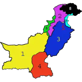 پاکستان از پنج ایالت، یک منطقهٔ خودمختار قبایلی، یک منطقه فدرال پایتخت (اسلامآباد) و دو منطقه مربوط به جامو و کشمیر تشکیل شدهاست.