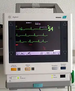 - مانیتور: وسیلهای شامل یک نمایشگر و ۳ یا چهار سیم است. که سیمها به قفسهسینه متصل شده و به این وسیله امواج الکتریکی قلب و ضربان قلب ثبت میشود. مانیتورها به صورت سیار و ثابت طراحی شدهاند. تعداد تختهای مجهز به تجهیزات مانیتورینگ یکی از متغیرهای مهم در یک بخش اورژانس میباشد.