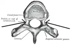 ![]() A cervical vertebra. (Pedicle labeled at upper right.) | |