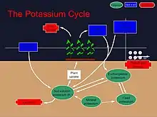 پتاسیم یک یون مهم در بدن است، چون تغییرات جزئی آن میتواند action potentials را مختل کند و در نتیجه مشکلات عصبی و قلبی ایجاد میشود، سطح آن در خون بهدقت تنظیم میشود. بسیاری از آنتیبیوتیکها، از جمله آنکه توسط باکتری Bacillus brevis تولید میشود، عملکرد سلولها را با نشستن بر روی کانالهای یون مثبت مختل میکنند. در نتیجه یونهای +k و +Na اجازه پیدا میکنند از غشاء سلولی عبور کنند و بنابراین action potential مختل میشود. پتاسیم در پلاسمای خون نسبتاً در سطح پائینی قرار دارد (معمولاً ۳٫۵ تا ۵٫۰ mmol/L)، ولی درون سلولها تجمع زیادی دارد (در حدود ۱۰0 mmol/L). سطوح پائین آن در خون هیپوکالمی (hypokalemia) و سطوح بالای آن هایپرکالمی (hyperkalemia) نام دارند. هر دو سطح پائین و بالا برای قلب خطرناکند. علائم کمبود آن در بدن شامل موارد زیر است: خستگی، خواب آلودگی، ضعف عضلانی، یبوست، نامنظمی ضربان قلب و تأخیر در تخلیه معدی. بهترین منابع غذایی پتاسیم؛ آرد سویا، لوبیا سفید، عدس، موز و اسفناج میباشد؛ ولی در بیشتر موادغذایی وجود دارد. رژیم غذایی غنی از کلسیم، پتاسیم و منیزیم و نیز محدود در سدیم باعث کاهش فشار خون بالا در افراد دچار فشار خون بالا میشود.