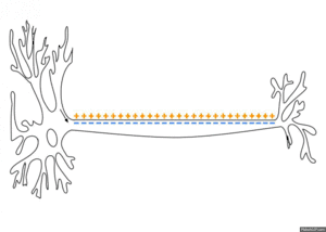 اطلاعات در طول نورون به شکل تکانهٔ شیمیائی - برقی حرکت میکند و از مناطق دندریتی به سوی انتهای آکسون میرود. توان ایجاد این پتانسیل عمل مختص نورونها و ناشی از انبوه مجراهای یونی (jon channels) و تلمبههای یونی (jon pumps) موجود در غشاء یاخته است. مجراهای یونی همان مولکولهای پروتئینی حلقوی است که منفذهای غشاء نورون را میسازند. این ساختارهای پروتئینی از راه باز و بسته کردن منفذها به تنظیم مبادلهٔ یونهای دارای بار الکتریکی نظیر سدیم (+Na) و پتاسیم (+K) و کلسیم (++Ca) یا کلر (-Cl) میپردازند، در تمام مدت پتانسیل آرامش یا پتانسیل عمل، هم خروج و هم ورود مواد به داخل سلول از طریق کانالهای نشتی امکانپذیر میشود و فقط وابسته به کانالهای دریچهدار نمیباشد؛ هر مجرای یونی (چه نشتی و چه دریچهدار) به صورت انتخابی عمل میکند و معمولاً به یون معینی اجازهٔ عبور میدهد. ساختارهای پروتئینی (تلمبههای یونی) جداگانهای از راه تلمبه کردن یونهای گوناگون به درون یا بیرون نورون، آنها را در دو سوی غشاء یاخته با توزیعی نامتوازن نگه میدارند. تلمبهٔ یونی از همین راه در شرایط استراحت نورون، تراکم زیاد +Na را در بیرون و تراکم اندک آن را در درون نورون حفظ میکند. اثر کلی تلمبهها و مجراهای یونی، قطبیسازی غشاء نورون است به طوری که بار الکتریکی (charge) مثبت در بیرون غشاء و بار الکتریکی منفی در درون آن میماند.
