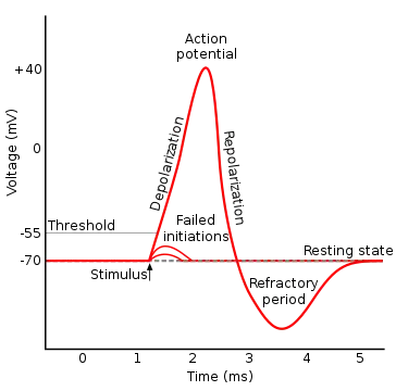 ۲- باز شدن کانالهای دریچهدار سدیمی 》 ورود سدیم به سلول در جهت شیب غلظت 》 انتشار تسهیل شده 》 مثبت شدن بار سطح داخل غشاء نسبت به خارج آن > بخش بالا رو نمودار پتانسیل عمل (از ۶۵- به سوی ۴۰+) افزایش ۱۰۵ میلی ولت پتانسیل[1] نورون.