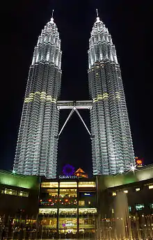 برجهای دوقلوی پتروناس، نهمین آسمانخراش جهان هستند، که در شهر کوالالامپور قرار گرفتهاند. برجهای دوقلو ۴۵۲ متر ارتفاع دارند. تعداد طبقات هر برج ۸۸ طبقه است و جمعاً ۷۸ آسانسور در این دو ساختمان فعال هستند. این دو برج از بخش زیرین، به هم وصل هستند، همچنین پلی طبقات ۴۱ و ۴۲ این دو برج را به هم متصل میکند.