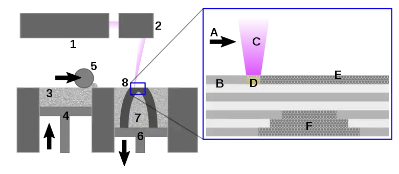 1 لیزر ۲ سیستم اسکنر ۳ سیستم تحویل پودر ۴ پیستون تحویل پودر ۵ غلتک ۶ پیستون پودر ساز ۷ ساخت بستر پودر ۸ جسم در حال ساخته (الحاق) یک لیزر جهت اسکن B متخلخل ذرات پودر (دولت قهوه ای) پخت C پرتو لیزر D لیزر E پیش بستر پودری قرار داده شده (حالت سبز) F مواد غیر سلولی در لایههای قبلی