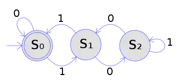 شکل سمت چپ، یک ماشین تعینپذیر حالات متناهی را با استفاده از نمودار حالتها نشان میدهد. در این ماشین اتوماتا، سه حالت S0، S1 و S2 وجود دارند (که در تصویر با دایره نشان داده شدهاند). ماشین اتوماتا دنبالهای از ۰ها و ۱ها را به عنوان ورودی دریافت میکند. برای هر حالت، به ازای هر یک از ۰ و ۱، یک بردار انتقال موجود است که به حالت بعد راهنمایی میکند. تا زمانی که یک نماد را میخوانیم، یک DFA به صورت تعیین پذیر و قطعی با دنبال کردن بردارهای انتقال از حالتی به حالت دیگر حرکت میکند. برای مثال، اگر ماشین اتوماتا در حالت S0 قرار دارد و نماد ورودی نیز ۱ است، به صورت قطعی به حالت S1 خواهد رفت. یک DFA دارای یک حالت آغازین است (با فلشی که از هیچ کجا به آن وارد میشود، نشان داده میشود) که محاسبات در آن آغاز میشوند، و یک مجموعه از حالات نهایی (با دایره دوخطه نشان داده میشوند) که کمک میکند زمانی را که محاسبات موفق شدهاست را تعریف کنیم. یک DFA به عنوان یک مفهوم ریاضی مطلق تعریف شدهاست، اما با توجه به ذات نعیینپذیر DFA، قابل پیادهسازی در سختافزار و نرمافزار برای حل مسائلی خاص و مختلف است. برای مثال یک DFA میتواند یک نرمافزار را که تصمیم میگیرد که آیا ورودی کاربر (برای مثال) یک آدرس ایمیل معتبر است یا نه، مدل کند. DFAها دقیقاً مجموعه زبانهای منظم را که، به غیر از موارد دیگر، برای انجام آنالیزهای واژگانی و تطبیقهای الگویی مفید هستند، میپذیرند. همچنین DFAها میتوانند از طریق ساخت مجموعه توانی از ماشینهای تعینناپذیر حالات متناهی ساخته شوند.