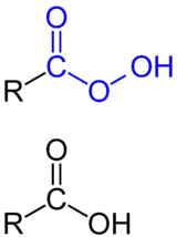 ساختار عمومی پراکسی اسیدها در بالا و ساختار عمومی یک کربوکسیلیک اسید در تصویر پایین.