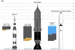 ۴)پرتابگر اژدها دریا (به انگلیسی:Sea Dragon) دو مرحله ای با ارتفاع ۱۵۰ متر که در سال ۱۹۶۲ طراحی شد. این پرتابگر به قدری بزرگ بود که قادر بود فقط از طریق دریا ۵۵۰ تن را به مدار نزدیک زمین ارسال کند، این پروژه به دلیل بسته شدن مرکز پروازهای فضایی مارشال ناسا هرگز عملیاتی نشد.[37][38]