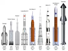 ۱) پرتابگر N1 بخشی از پروژه ارسال انسان به ماه بود که توسط شوری بین سالهای ۱۹۶۹–۱۹۷۲ تحت توسعه بود و توان انتقال ۹۵ تن را به مدار نزدیک زمین داشت.[33] در نهایت این برنامه در ماه مه ۱۹۷۴ به دلیل چهار پرواز ناموفق به حالت تعلیق درآمد و بهطور رسمی در مارس ۱۹۷۶ لغو شد.[34][35]