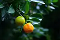 چند پرتقال نیمه رسیده روی شاخهٔ درخت