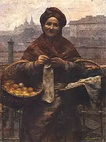 اثر با تکنیک رنگ روغن در سال ۱۸۸۰–۱۸۸۱ در ورشو نقاشی شدهاست. این نقاشی یک فروشنده یهودی را نشان میدهد و اثر معروف دیگر هنرمند لیمو فروش یهودی است. زن نشان دهنده در تابلو لباس فقیرانه، کلاهی بر سر و شالی بر روی شانههای خود دارد. او دو سبد پرتقال حمل میکند. پس زمینه نقاشی، سقف خانههای ورشو را نشان میدهد. صورت زن جدی است و گونههای برجسته و چین و چروکهای عمیق او باعث افزایش تأثیر غم و ناتوانی میشود که مستقیماً از شخصیت او نشات میگیرد. در مقابل، پرتقالهایی وجود دارد که رنگ آنها به زندگی، گرما و آب و هوای جنوبی اشاره دارد. نقاش نام خود را در گوشه پایین سمت چپ امضا کرده و نام شهری را که در آن نقاشی را کشیده بود، قرار دادهاست.[2]
