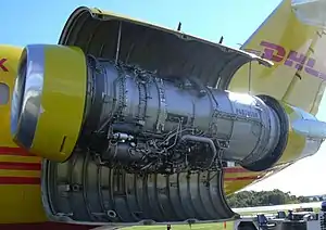 | A JT8D pictured mounted on a مکدانل داگلاس دیسی-۹ operated by DHL at the فرودگاه جت بینالمللی پورتلند in 2004 | |