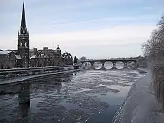 نمایی از شرق شهر پرت در اسکاتلند به همراه رودخانه «تی» و پل فرایرتن