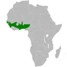 این پرنده در کشورهای بنین، بورکینافاسو، کامرون، ساحل عاج، گامبیا، غنا، گینه، گینه بیسائو، مالی، نیجر، نیجریه، سنگال، سیرالئون، و توگو یافت میشود.