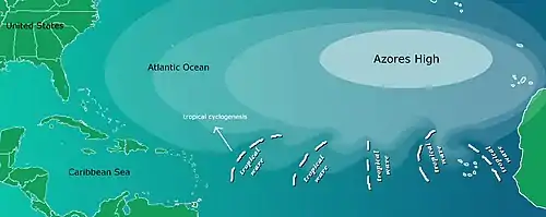 جهت چرخش هوا در سامانههای پرفشار در نیمکره شمالی، در جهت عقربههای ساعت است که این موضوع باعث رانده شدن امواج شرق آفریقا به آفریقای غربی، دریای کاراییب و آمریکای مرکزی میشود که در فصل تابستان در این نقاط باعث ایجاد توفانهای استوایی میشوند.[4]