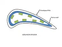 سطح تیغه از مواد متخلخل ساخته شدهاست که به معنی داشتن تعداد زیادی حفره کوچک روی سطح است. خنککننده هوا از طریق این سوراخهای متخلخل که یک نوار یا یک لایه مرزی خنککننده را تشکیل میدهند کار میکند. علاوه بر این، این سرمایش یکنواخت در اثر پراکندگی مایع خنککننده در کل سطح تیغه ایجاد میشود.