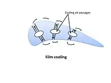 خنککننده فیلم (همچنین به عنوان خنککننده فیلم نازک نیز شناخته میشود)، نوعی از پرکاربرد بودن، تأثیر خنککننده بالاتری را نسبت به خنککننده همرفت و انقباض فراهم میکند.[18] این تکنیک شامل پمپ کردن هوای خنککننده از تیغه از طریق چندین سوراخ کوچک یا شکاف در سازه است. یک لایه نازک (هوا) از هوا خنککننده در سطح خارجی تیغ ایجاد میشود ، انتقال حرارت از جریان اصلی را کاهش میدهد، که دمای آن (۱۳۰۰–۱۸۰۰ کلوین) میتواند از نقطه ذوب ماده تیغه (۱۳۰۰–۱۴۰۰ کلوین)[19][20] توانایی سیستم خنککننده فیلم برای خنک کردن سطح بهطور معمول با استفاده از پارامتری به نام اثربخشی خنککننده ارزیابی میشود. اثر خنککننده بالاتر (با حداکثر مقدار یک) نشان میدهد که دمای ماده تیغه به دمای خنککننده نزدیکتر است. در مکانهایی که دمای تیغه به دمای گاز داغ نزدیک میشود، اثر خنککننده به صفر نزدیک میشود. اثر خنککننده عمدتاً تحت تأثیر پارامترهای جر