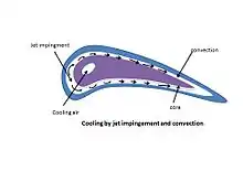 با عبور هوای خنککننده از معابر داخلی تیغه آنرا خنک میکند. گرما توسط رسانش گرمایی از طریق تیغه منتقل میشود. یک سطح بزرگ داخلی برای این روش مطلوب است، بنابراین مسیرهای خنککننده پر از مارپیچ و منفذهای کوچک هستند. معابر داخلی تیغه ممکن است به صورت دایره ای یا بیضوی باشند. خنک شدن با عبور هوا از طریق این معابر از توپی تیغه به سمت نوک آن حاصل میشود. این هوای خنککننده از یک کمپرسور هوا تهیه میشود. در توربین گازی، مایع خارج شده از آن نسبتاً گرم است که از خنککننده عبور میکند و با جریان اصلی در نوک تیغه مخلوط میشود.