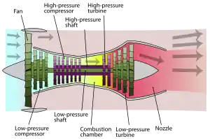 در موتور توربین گازی، یک محور وجود دارد که بیشتر پرههای توربین به آن وصل میشوند. آن بخش توربین از طریق محور (یا "شفت") دیگری به یک کمپرسور وصل میشود و آن بخش کمپرسور میتواند نیروی محوری یا گریز از مرکز را تحمل کند. هوا از طریق کمپرسور فشرده میشود و فشار و دما را بالا میبرد. سپس دمای احتراق با سوختن مواد داخل محفظه احتراق، که بین کمپرسور و توربین قرار دارد، افزایش مییابد. گازهای خروجی با دمای بالا و فشار بالا از توربین عبور میکنند. توربین انرژی را از این جریان استخراج میکند، فشار و دمای هوا را پایین میآورد و انرژی جنبشی را به کمپرسور در امتداد محور مرکزی منتقل میکند. این فرایند بسیار شبیه به نحوه کار یک کمپرسور محوری به صورت معکوس، است.