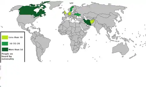 اختلاف ظاهری موجود در این گزارشها به این دلیل است که تقریباً نیمی از مسافران تابعیت دوگانه داشتهاند و ایران هم اتباع دوگانه را فقط به عنوان شهروندان ایرانی میشناسد. این مسافران هنگام ورود و خروج از کشور باید از گذرنامههای ایرانی خود استفاده کنند و بنابراین به عنوان ایرانی در مراجع مرزی ایران ثبت میشوند اما برای سوار شدن به هواپیما پاسپورت غیر ایرانی را به خط هوایی ارائه مینمایند.[73][74][75]