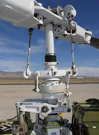 - میلههای کنترلگر (control rods) سه میلهٔ ایستا هستند که در تصویر روبرو در پایینترین بخش از توپی در حاشیهٔ بدنهٔ بالگرد جای دارند و نوک آنها مشخص است. این سه میلهٔ کنترلگر زیر سواشپلیت ایستا نصب شدهاند و دستورها خلبان را از سکان به سواشپلیت ایستا منتقل میکنند که به دنبال آن، از بخش ایستا به سواشپلیت گردان و سپس توپی و سپس تیغهها منتقل خواهد شد.