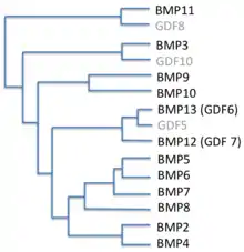 | BMP2 | همچون یک هومودایمر متصل به دیسولفید عمل میکند و تشکیل غضروف و استخوان را تحریک میکند. احتمال دارد پروتئین واسط رتینوئید باشد. در تمایز سلولی استئوبلاستها هم نقش دارد. | کروموزوم ۲۰؛ جایگاه: 20p12 |