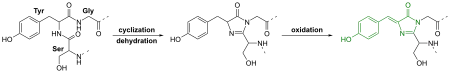 - Pouwels LJ, Zhang L, Chan NH, Dorrestein PC, Wachter RM (Sep 2008). "Kinetic isotope effect studies on the de novo rate of chromophore formation in fast- and slow-maturing GFP variants". Biochemistry. 47 (38): 10111–22. doi:10.1021/bi8007164. PMC 2643082. PMID 18759496.