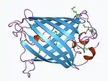 ![]() مولکولهای GFP به سبک کارتونی ترسیم شدهاند ، یکی کاملاً و دیگری کنار بشکه بتا بریده شده تا کروموفور را نشان دهد (برجسته شده به صورت گلوله و چوب ). از پیدیبی 1GFL . |