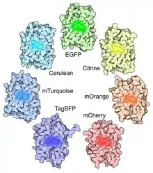 بسیاری از جهش های دیگر از جمله جهش های رنگی ایجاد شده است. به طور خاص ، پروتئین فلورسنت آبی (EBFP ، EBFP2 ، Azurite ، mKalama1) ، پروتئین فلورسنت آبی (ECFP ، Cerulean ، CyPet ، mTurquoise2) و مشتقات پروتئین فلورسنت زرد (YFP ، سیترین ، ونوس ، یپت). مشتقات BFP (به استثنای mKalama1) حاوی جایگزینی Y66H هستند. آنها یک باند جذب گسترده در ماوراio بنفش با مرکز نزدیک به 380 نانومتر و حداکثر انتشار در 448 نانومتر از خود نشان می دهند. یک جهش پروتئین فلورسنت سبز ( BFPms1 ) که ترجیحاً روی (II) و مس (II) را متصل می کند ایجاد شده است. BFPms1 دارای چندین جهش مهم از جمله و BFP chromophore (Y66H) ، Y145F برای عملکرد کوانتومی بالاتر ، H148G برای ایجاد یک سوراخ در بتا بارل (ساختار بشکه بتا) و چندین جهش دیگر است که حلالیت را افزایش می دهد. اتصال روی (II) شدت فلورسانس را افزایش می دهد ، در حالی که اتصال مس (II) باعث مهار فلورسانس می شود و حداکثر جذب را از 379 به 444 نانومتر تغییر می دهد. بنابراین ، می توان از آنها به عنوان حسگر زیستی Zn استفاده کرد. [19]