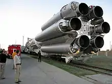 ![]() Proton-M rocket being transported to its launchpad | |