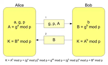 - هر یک از دو طرف با استفاده از عمل به توان رسانی پیمانه ای و مقادیر قبلی (p و g و مقدار پنهانی)، یک مقدار جدید محاسبه کرده (A و B) و برای طرف مقابل ارسال میکند.