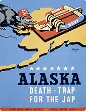 پوستر مربوط به ناحیه سیزده نیروی دریایی آمریکا، در تصویر موشی را که نماد کشور ژاپن است نشان میدهد که به تله نیروی دریایی آمریکا نزدیک میشود.