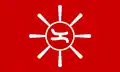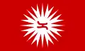 | طرح | A horizontal bicolor of blue over red, with a white equilateral triangle at the hoist containing three, 5-pointed gold stars at its vertices, and an 8-rayed gold sun at its center. |
