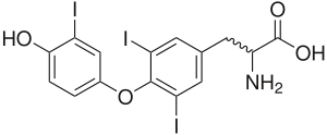 | ترییدوتیرونین (T3, pictured) and thyroxine (T4) are both forms of thyroid hormone. | |