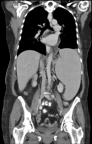 | CT scan showing splenomegaly in a patient with chronic lymphoid leukemia | |