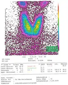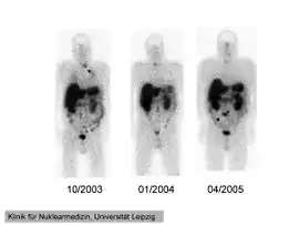 نخستین آزمایش استفاده از تزریق رادیوایزوتوپ در تصویربرداری از یک انسان، توسط هرمان ال بلومگارت و سوماً وایس از دانشگاه هاروارد انجام گرفت. این آزمایش در سال ۱۹۲۷ و بهکمک یک اتاقک ابری و رادون انجام گرفت. با وجود تلاشهای فراوان، این آزمایشها موفقیتآمیز نبودند، و این محققان آزمایشگاه ملی لارنس برکلی بودند که برای نخستین بار توانستند با موفقیت از یک رادیوایزوتوپ در محیطی بالینی بهره ببرند. آنها به کمک سیکلوترون معروف خود ایزوتوپ ید-۱۳۱ تولید کردند که برای پروژههای تیروئیدی بکار رفت. از همین ایزوتوپ مدت کوتاهی بعد برای سرطان تیروئید و پرکاری تیروئید استفاده گردید.