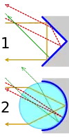 Comparison of the effect of corner (1) and spherical (2) retroreflectors on three light rays. Reflective surfaces are drawn in dark blue.