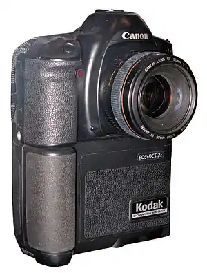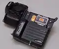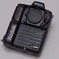پشتی دیجیتال ساخته شده برای Nikon N90 s/x که یک دوربین SLR است (در کنار دوربین).