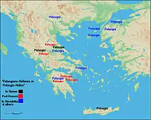 - مشارکتکنندگان ویکیپدیا. «Pelasgians». در دانشنامهٔ ویکیپدیای انگلیسی، بازبینیشده در ۱۷ ژوئیه ۲۰۱۵.