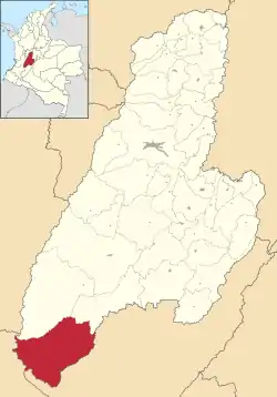 ![]() Location of the municipality and town of Planadas in the Tolima Department of Colombia. | |