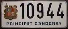 پلاکهای خودرو آندورا از یک حرف و چهار رقم (لاتین)(به عنوان مثال A1234) تشکیل شده است، و آرم آندورا در سمت چپ قرار دارد و سریال " Principat d' Andorra" به رنگ آبی در زیر پلاک قرار دارد. مشخصات پلاک بارنگ مشکی در یک پس زمینه سقید قرار دارد.