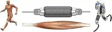 به عنوان آیندهنگرترین جهت تحقیقات عملی، EAP در ماهیچههای مصنوعی استفاده میشود که نمونهای از آن در شکل ۶ نشان داده شدهاست.[25] توانایی آنها در تقلید از عملکرد عضلات بیولوژیکی با ضخامت بالای شکستگی، فشار زیاد تحریک و لرزش ذاتی توجه دانشمندان در این زمینه را به خود جلب میکند.[5]