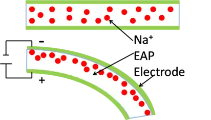{{درشت|EAPهای یونی، که در آنها تحریک، ناشی از جابجایی یونها در داخل پلیمر است. فقط چند ولت برای فعالسازی مورد نیاز است، اما جریان یونی به معنای قدرت الکتریکی بالاتری است که برای تحریک لازم است و انرژی لازم برای نگه داشتن محرک در یک موقعیت معین است. نمونههایی از EAPS یونی شامل پلیمرهای رسانا، کامپوزیتهای پلیمری فلزی یونی (IPMC) و ژلهای پاسخگو هستند. نمونه دیگر یک محرک ژل باکی است، که یک لایه پلیمر با پشتیبانی از پلی الکترولیت است که از یک مایع یونی ساخته شده بین دو لایه الکترود متشکل از یک ژل مایع یونی تشکیل شده از نانولولههای کربنی تک دیواره تشکیل شدهاست.[15] این نام از شباهت ژل به کاغذ حاصل میشود که میتواند با فیلتر کردن نانولولههای کربن، به اصطلاح باکتری، ساخته شود.[16]