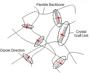 پلیمرهای پیوند الکتریکی دارای زنجیره ستون فقرات قابل انعطاف با زنجیرههای جانبی انشعاب هستند. زنجیرههای جانبی روی پلیمرهای ستون فقرات همسایه متصل میشوند و واحدهای کریستالی را تشکیل میدهند. واحدهای کریستالی ستون فقرات و زنجیره جانبی میتوانند مونومرهای قطبی شده را تشکیل دهند، که دارای اتمهایی با بارهای جزئی و ایجاد لحظههای قطبی هستند، که در شکل ۲ نشان داده شدهاست.[13] هنگامی که یک میدان الکتریکی اعمال میشود، بر روی هر بار جزئی نیرویی اعمال میشود و باعث چرخش کل واحد پلیمر میشود. این چرخش باعث ایجاد فشار الکتریکی و تغییر شکل پلیمر میشود.