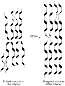 پلیمرهای بلوری مایع زنجیره اصلی دارای گروههای مزوژنیک هستند که توسط یک فضای انعطافپذیر به یکدیگر متصل میشوند که در شکل ۳ نشان داده شدهاند. مزوژن درون ستون فقرات ساختار مزوفاز را تشکیل میدهد و باعث میشود خود پلیمر یک ترکیب سازگار با ساختار مزوفاز را اتخاذ کند. اتصال مستقیم منظم کریستالی مایع با ترکیب پلیمر باعث ایجاد علاقه زیادی به الاستومرهای بلوری مایع با زنجیره اصلی شدهاست.[14] سنتز الاستومرهای بسیار گرویده منجر به تحریک حرارتی کرنش بزرگ در طول جهت زنجیره پلیمر با تغییر دما و در نتیجه خواص مکانیکی منحصر به فرد و کاربردهای بالقوه به عنوان محرک مکانیکی میشود.