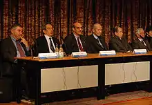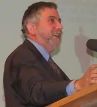 ![]() کروگمن در یک کنفرانس مطبوعاتی پس از دریافت جایزه نوبل در اقتصاد در سال ۲۰۰۸ | |