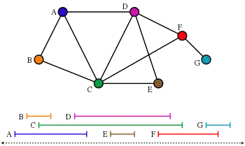 فرض کنید که رئوس گراف G ترتیب کامل داشته باشند. در این صورت عدد انفصال G، کوچکترین عدد مانند s است، بهطوریکه برای هر رأس v، حداکثر s رأس قبل v به ترتیب میآیند و رئوس بعد آن همسایههای v هستند. عدد انفصال رأسی G کوچکترین عدد انفصال رأسی از هر ترتیب کامل G است. عدد انفصالی رأسی توسط (Ellis, Sudborough & Turner (1983 تعریف شد و برابر پهنای مسیر G است؛ و میتوان گفت عدد انفصال رأسی هم ازی با اندازهٔ کلیک گراف بازهای دارد به این صورت که: اگر G زیرگراف یک گراف بازهای I باشد (مانند شکل) بهطوریکه تمام نقاط انتهایی بازهها مجزا باشند، در این صورت ترتیب نقاط انتهای چپ بازههای I دارای عدد انفصال رأسی یکی کمتر از اندازهٔ کلیک I است. به عبارتی دیگر از یک ترتیب کامل G، یک نفر ممکن است یک نمایش بازهای را در نظر بگیرد که در آن نقاط انتهای چپ بازهها برای یک رأس v، مکان آن در ترتیب باشد و نقاط انتهای راست مکان همسایهٔ v باشد که در آخر ترتیب میآید.