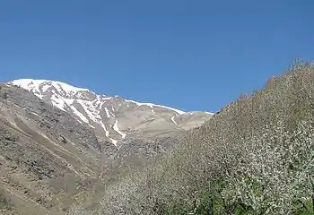 دامنهٔ شرقی رشتهکوه پهنه سار (پهنهحصار) در اردیبهشت. آبشار سنگان در وسط تصویر دیده میشود.