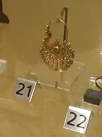 گوشواره، آنها را چند طبقهای به صورت بتههای ظریف و توری طلا که به وسیله رشتههای ظریفی به هم وصل میشدند، میساختند.[34]