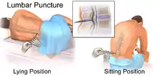 ![]() پونکسیون لومبار در وضعیت نشسته. ماده قهوهای بر روی کمر بیمار مربوط به ضد عفونی با تنتور ید یا بتادین است. | |